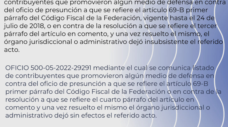 Read MoreSECRETARIA DE HACIENDA Y CRÉDITO PUBLICO OFICIO 500-05-2022-29290 mediante el cual se comunica listado de contribuyentes que promovieron algún medio de defensa