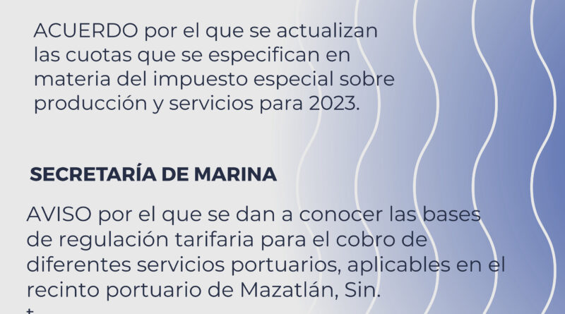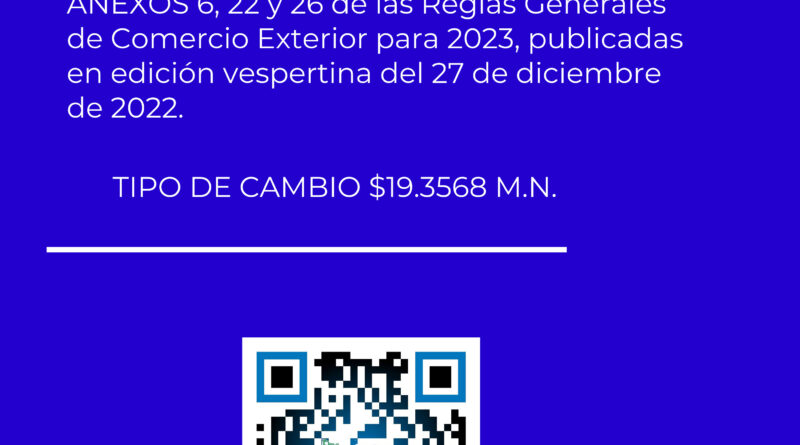 Read MoreSECRETARÍA DE HACIENDA Y CRÉDITO PÚBLICO ANEXO I de las Reglas Generales de Comercio Exterior para 2023 https://www.dof.gob.mx/nota_detalle.php?codigo=5675900&fecha=28/12/2022 ACUERDO por el