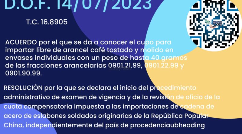 RESOLUCIÓN por la que se declara el inicio del procedimiento administrativo de examen de vigencia y de la revisión de oficio de la cuota compensatoria impuesta a las importaciones de cadena de acero de eslabones soldados originarias de la República Popular China, independientemente del país de procedencia.https://www.dof.gob.mx/nota_detalle.php?codigo=5695656&fecha=14/07/2023